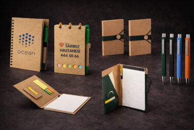 Geri dönüştürülmüş malzemeler, tohumlu kalemler, kraft kapak defterler — çevre dostu kurumsal imaj için.
