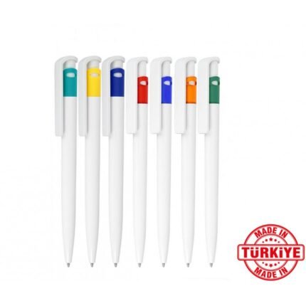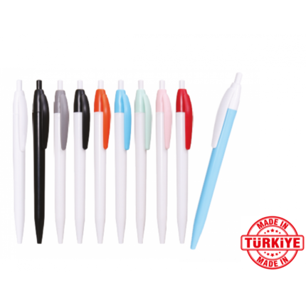 Plastik Tükenmez Kalem | Geniş Baskı Alanlı Beyaz Gövde, Renkli Buton Mekanizmalı Yerli Üretim Promosyon Kalemi