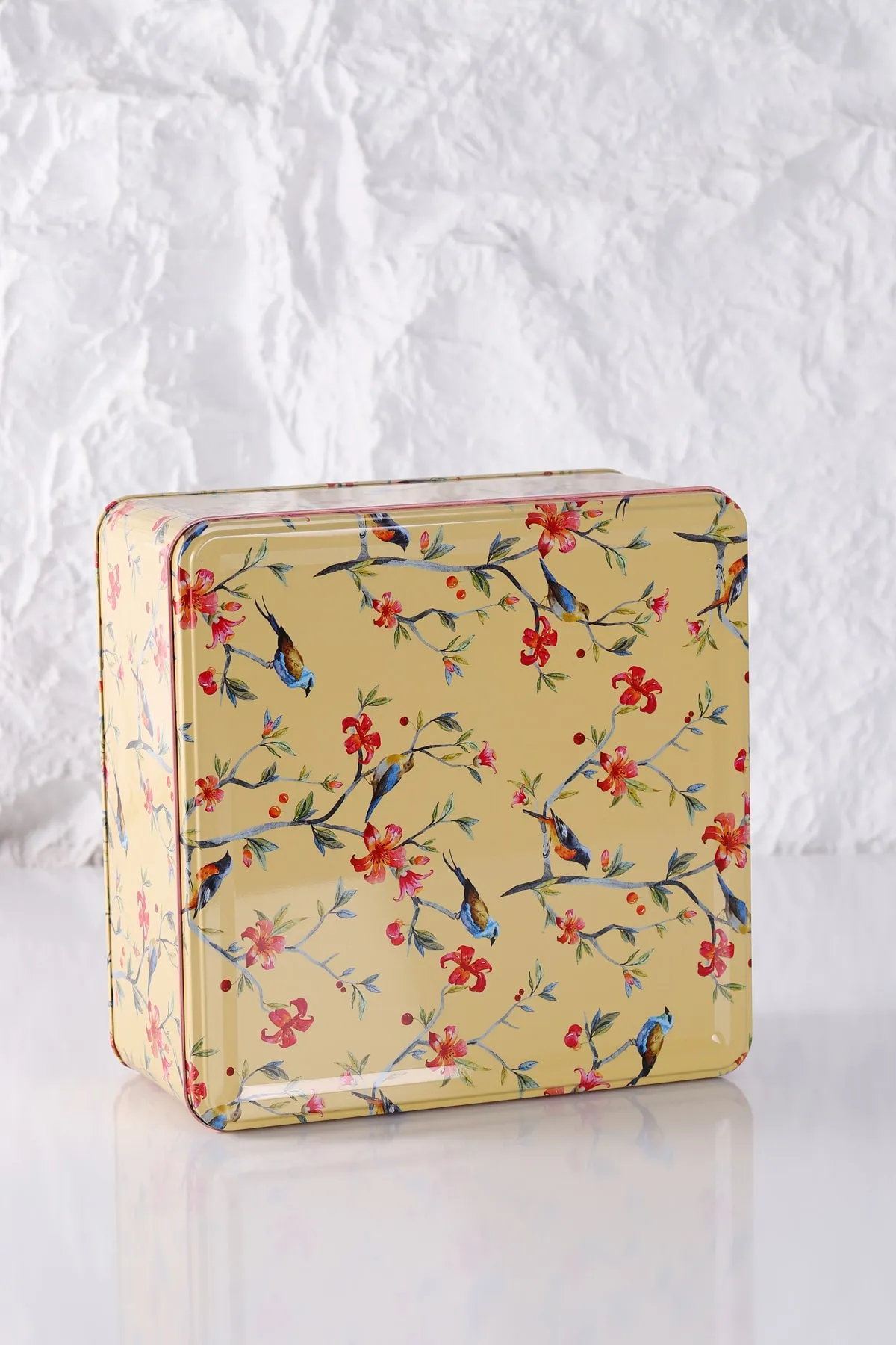 3’lü Set Bahar Temalı Kare Metal Teneke Kutu | Dekoratif Kuş ve Çiçek Desenli Metal Saklama Seti