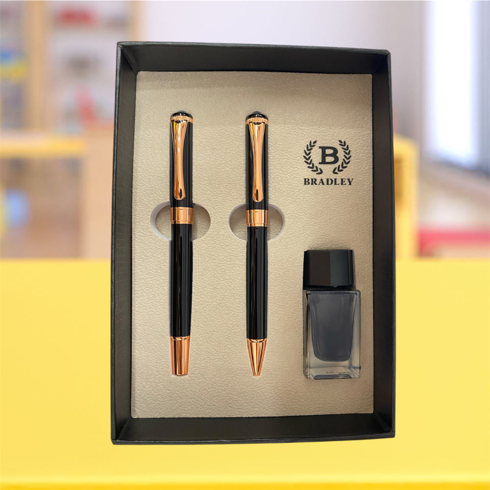 Bradley VIP Üçlü Yazım Takımı | Dolma & Tükenmez Kalem + Mürekkep | Lazer Baskılı Lüks Hediye Seti