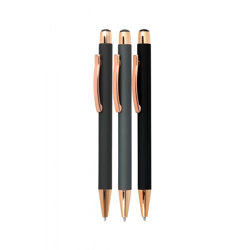 Mat rubber (kauçuk) kaplamanın ipeksi dokusunu, parıltılı Rose Gold detaylarla birleştiren bu model, promosyonda lüksü yeniden tanımlıyor. Gövdeyi saran soft-touch yüzey elden kaymayan konforlu bir yazım sunarken, bakır renkli klips ve uç detayları markanıza yüksek bir değer algısı katar. Lazer baskı ile kişiselleştirildiğinde, logonuz Rose Gold aksamlarla uyum içinde parlayarak şık bir kontrast oluşturur.